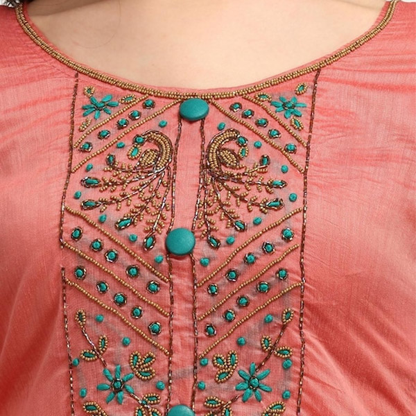 • Peach-coloured and teal green, gold-toned embroidered unstitched dress material